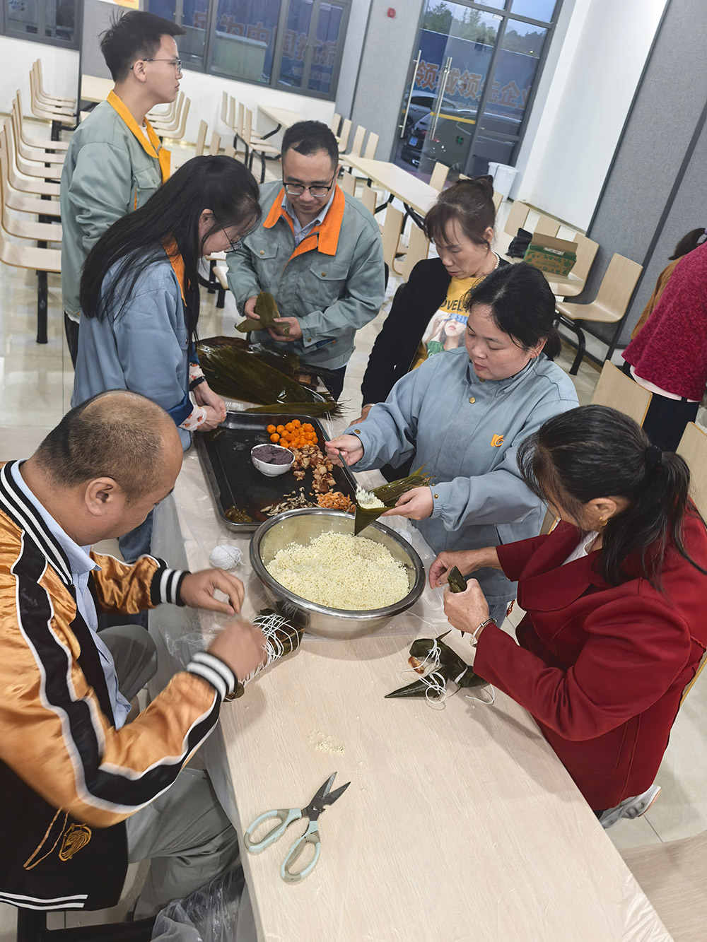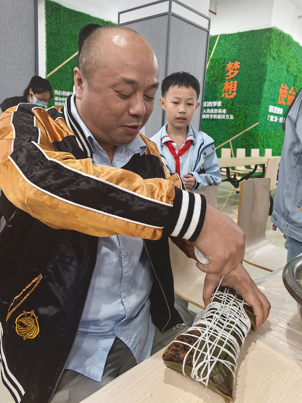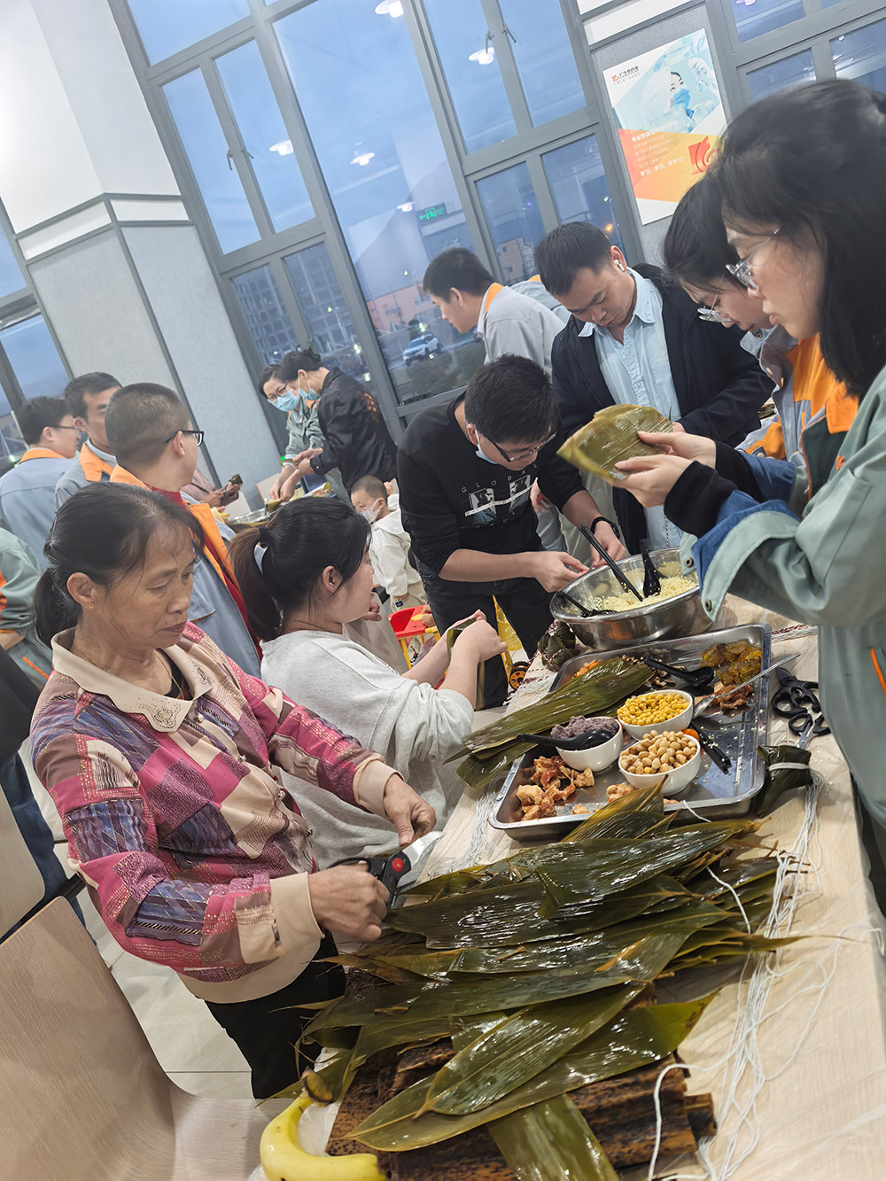科技中心的欢笑声回荡的同时,柘荣生产基地则上演了一场温馨的“‘粽’香传情·家企共融”主题活动。来自全国各地的员工与家属齐聚一堂,将天南地北的习俗融入粽叶之中。粽叶翻飞间,三角粽、四角粽、长条粽形态各异;豆沙蛋黄、鲜肉陈皮等馅料咸甜交织。大家一边制作创意满满的“全家福”粽子,一边分享家乡端午故事,互道节日祝福,共享佳节良时。非遗文化体验与包粽技艺比拼,不但传承了传统民俗,更生动诠释了爱体育深厚的“家文化”,让员工家属深切感受到企业的关怀。
